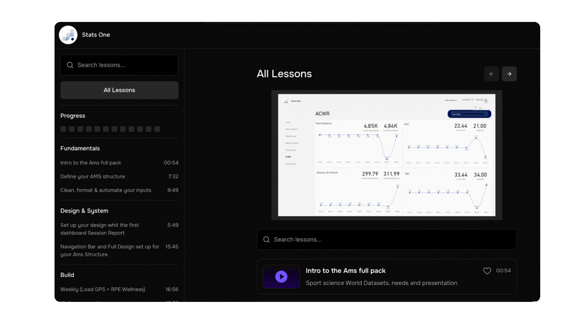 Each lesson is practical, showing exactly how to connect your data, master your dashboards, and adapt metrics like Z-Score or ACWR to your context.